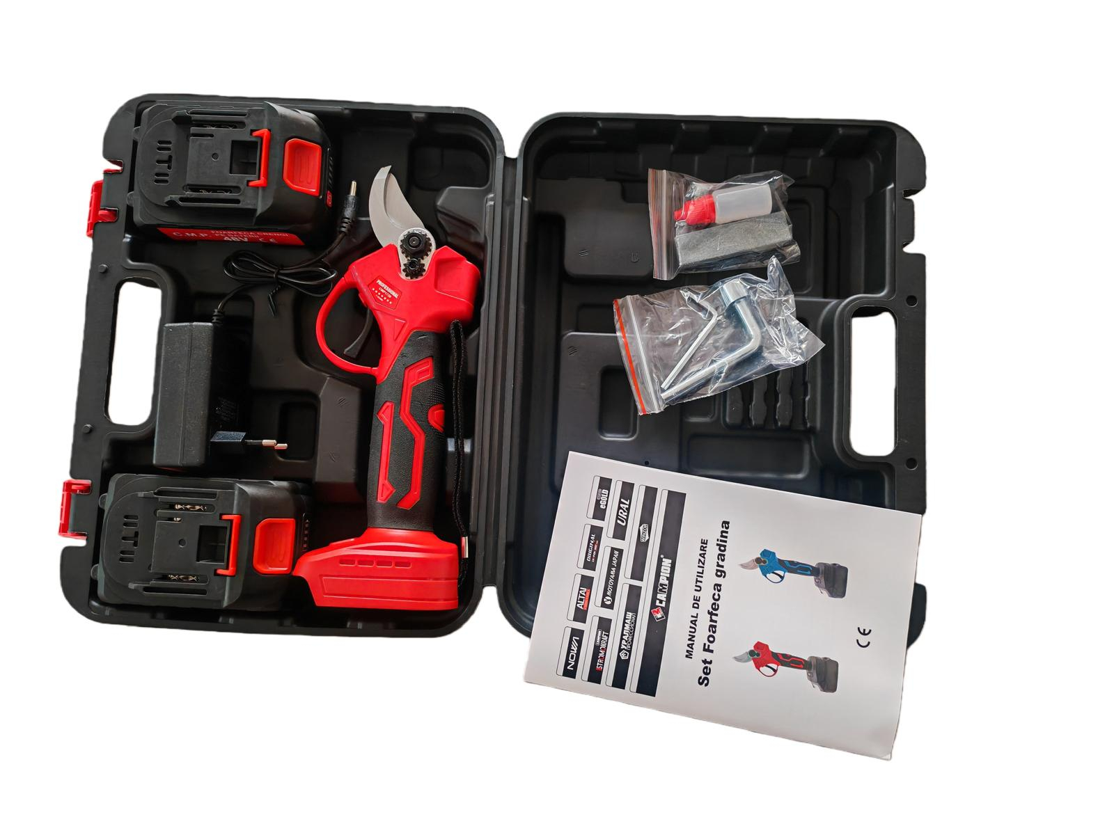 Foarfeca electrica de taiat crengi 48V – 2 acumulatori 8Ah, incarcator, geanta transport