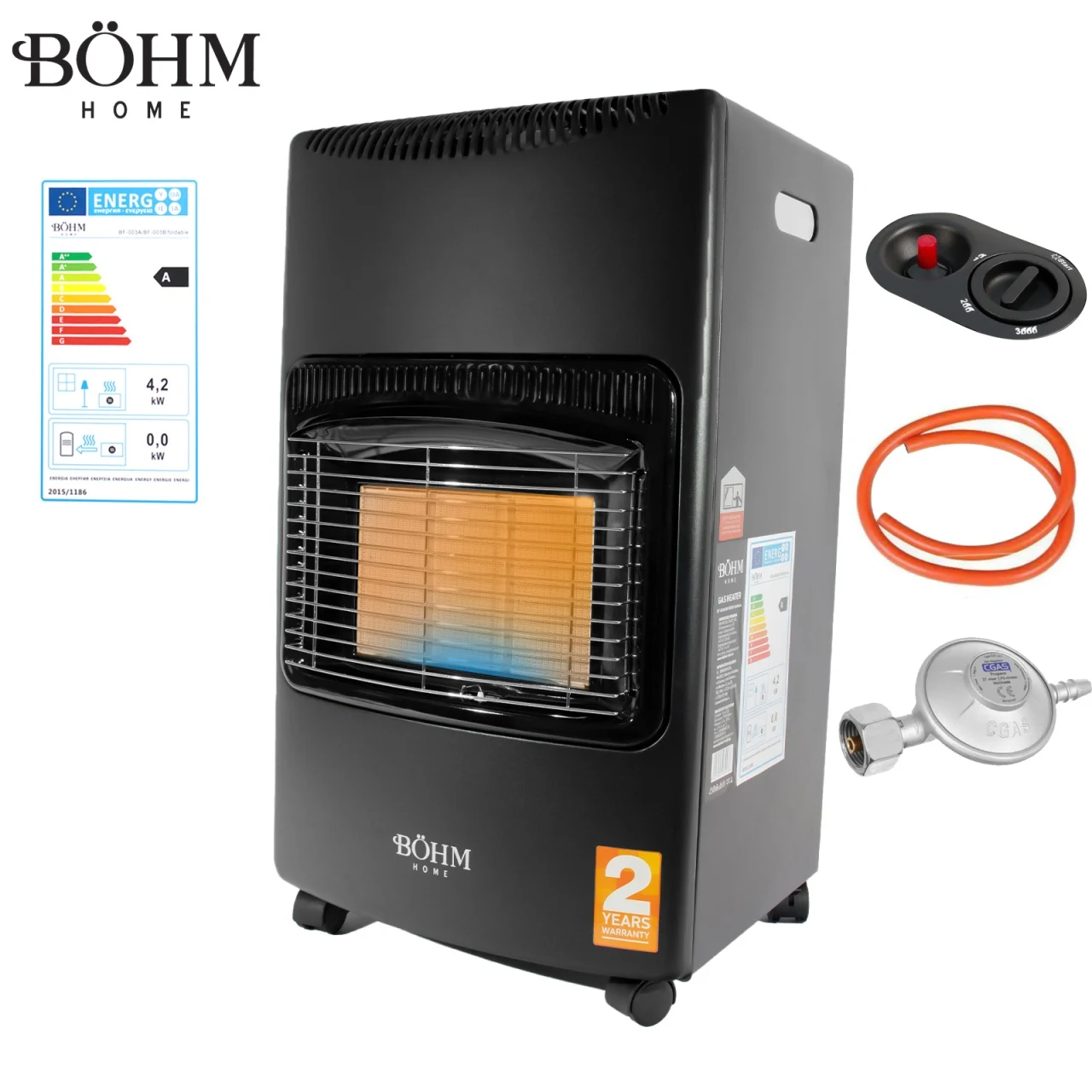 Soba pe gaz GPL BÖHM BF-003A este solutia perfecta pentru incalzirea rapida si eficienta a spatiilor interioare, fiind ideala pentru locuinte, birouri sau alte incaperi cu dimensiuni intre 20 si 80 m². Aceasta soba functioneaza cu gaz GPL si ofera o putere calorica maxima de 4.20 kW, asigurand o caldura constanta si confortabila. Datorita celor trei trepte de putere disponibile, poti alege intre 1.55 kW, 2.9 kW sau 4.20 kW, in functie de nevoile tale de incalzire.