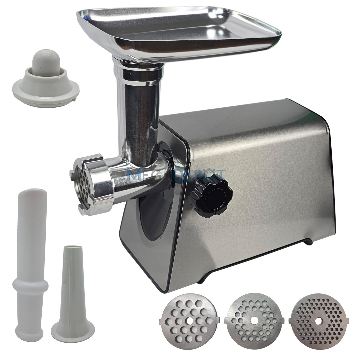 Masina de tocat carne, electrica 2800W, Functie Reverse, 3 site incluse, Accesoriu carnati, Accesoriu chiftele, Inox