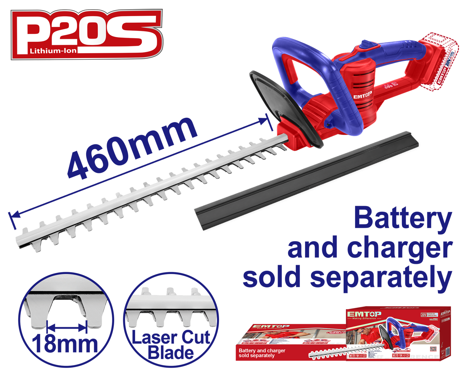 Masina de tuns gard viu si pomi fara acumulator si incarcator, lama 460mm - ELHT20018, EMTOP