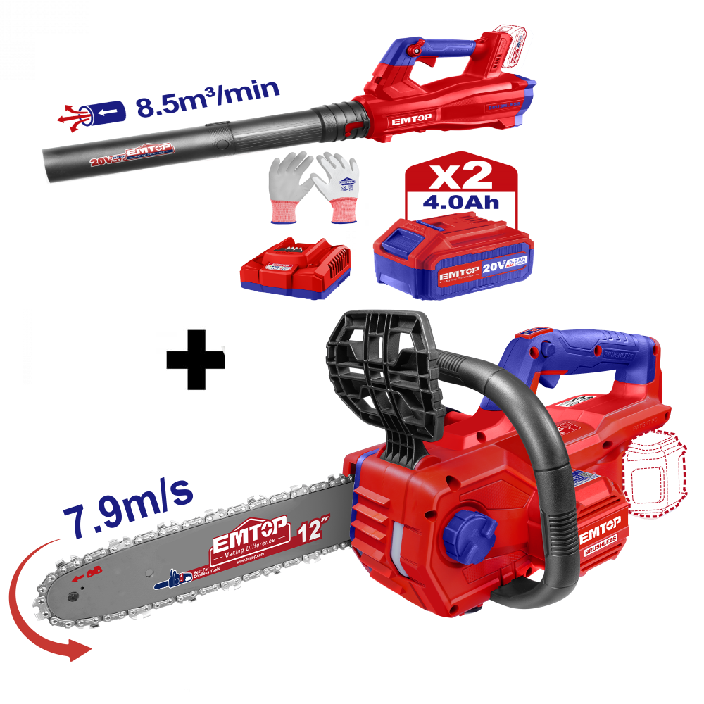 Pachet promo Drujba cu lant, motor fara perii (brushless), 30cm + Suflanta, motor fara perii (brushless), 8.5m3/min + 2 acumulatori 4.0Ah + incarcator