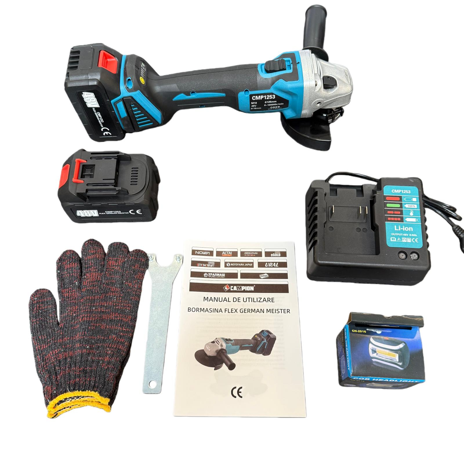 Polizor unghiular (flex) 48V/8Ah, Manusi + Lanterna incluse, Geanta de transport