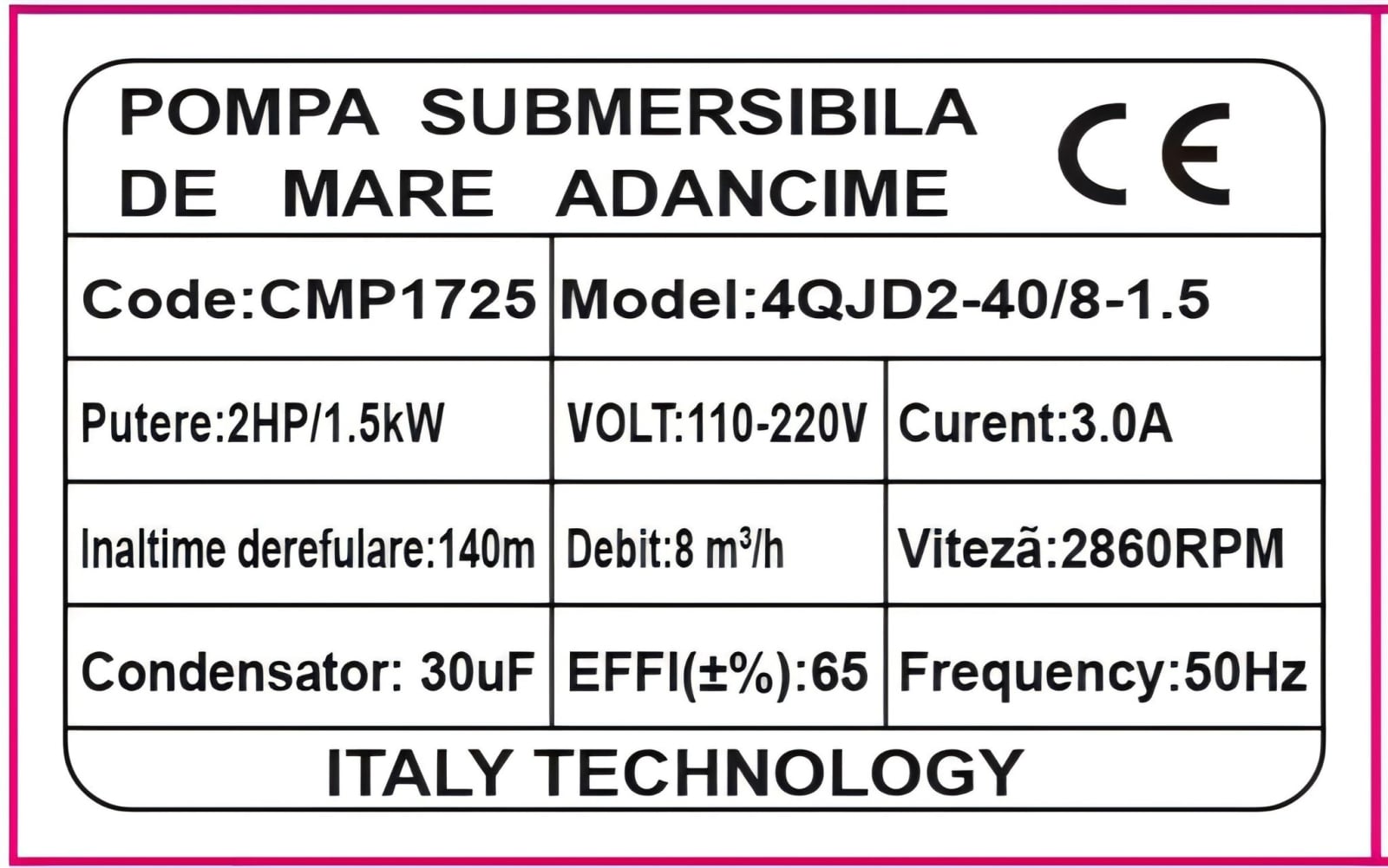 Cu o putere de 1.5kW, pompa asigura un debit maxim de 8 m³/ora, mentinand totodata o inaltime de refulare de pana la 140 m, ceea ce o face potrivita pentru aplicatii care necesita atat volum mare de apa, cat si presiune ridicata. Viteza de rotatie de 2860 rot./min. garanteaza functionare stabila si randament optim.