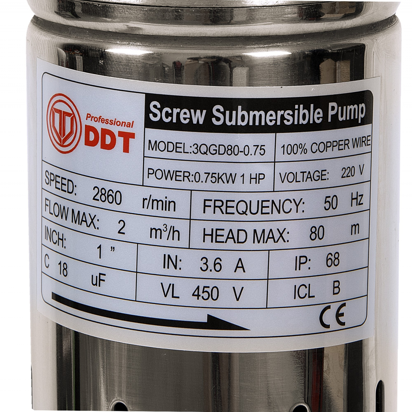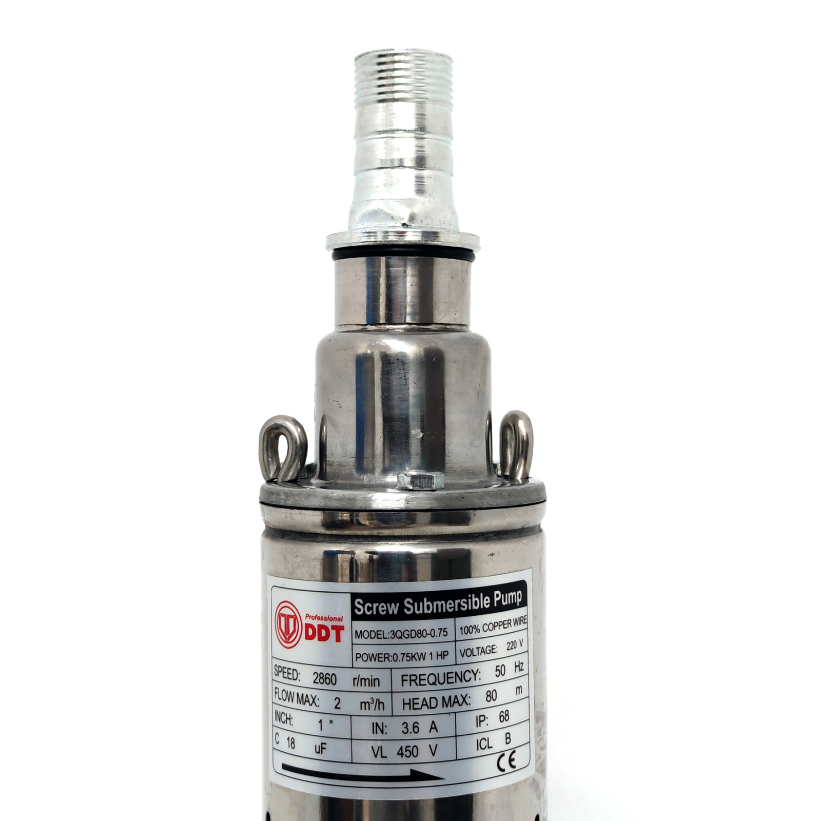 Pompa submersibila DDT 0001 are diametru exterior redus (75 mm), ceea ce permite introducerea in puturi de mare adancime cu diametru minim de 85 mm.