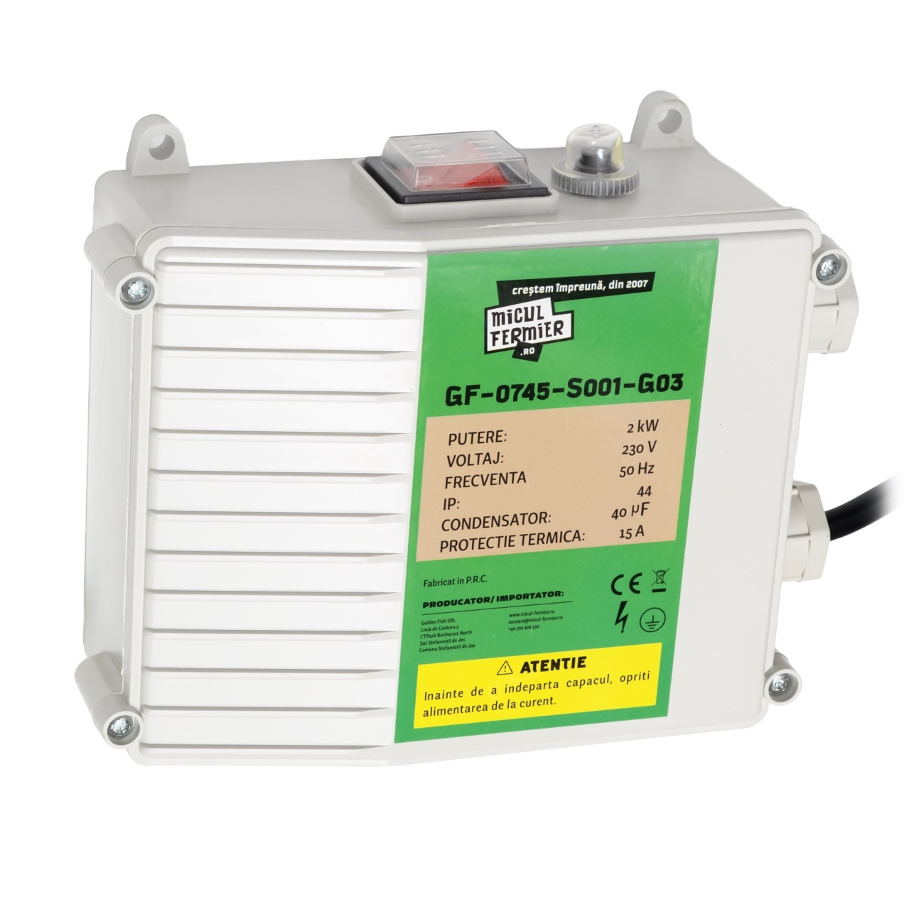 Pompa submersibilă Micul Fermier GF-0745-S001-G03 este proiectată pentru extracția eficientă a apei curate din puțuri de mare adâncime, având o putere de 2kW și un debit maxim de 3000 l/h, cu o înălțime de pompare de până la 100 metri. Este echipată cu două turbine performante care asigură un debit hidraulic ridicat și o eficiență energetică superioară.