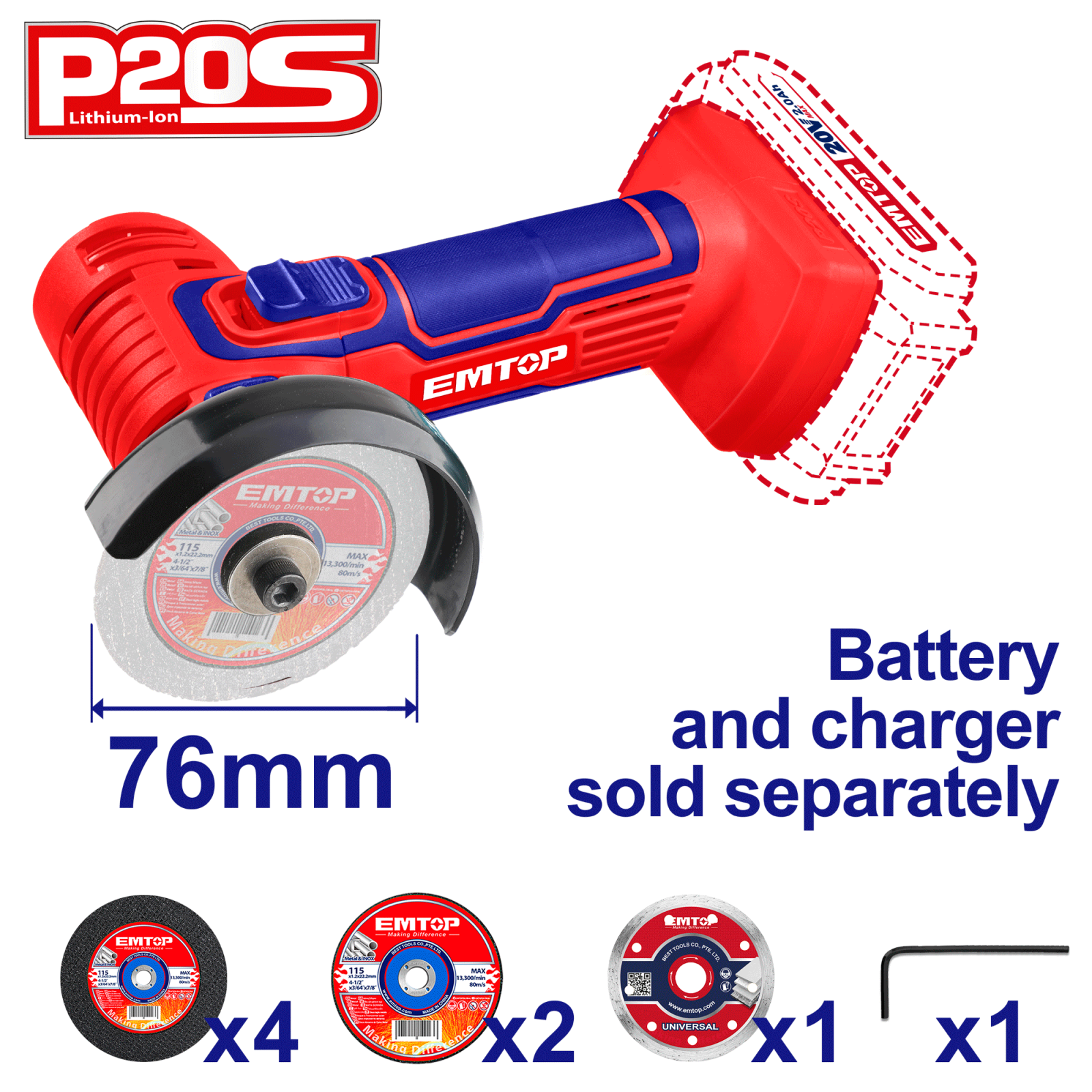 Tensiune: 20V Viteza in gol: 19500rpm Diametrul discului: 76 mm (3") Filet ax:M6 Locatia discului: stânga include: 4 buc. disc de taiere metal abraziv 2 buc. discuri abrazive de slefuire din metal 1 disc diamant umed Acumulatorul si incarcatorul se vând separat Ambalat in cutie colorata